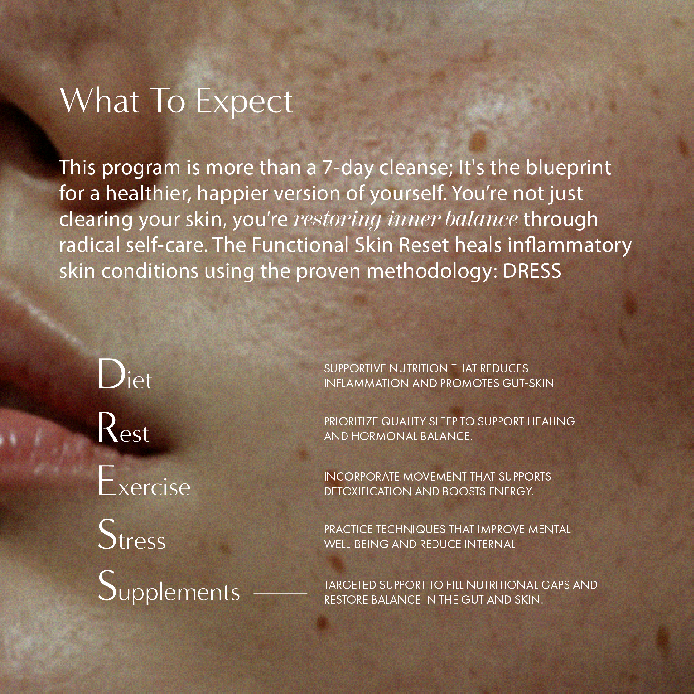 The Functional Skin Reset was created to help you target your internal imbalances and empower the body’s natural healing processes tosupport a clear, radiant complexion from the inside out.